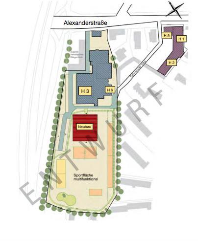 In den Außenplatz-Entwürfen der Stadtverwaltung sind vielfältige Sportanlagen vorgesehen, die die Sportfläche hinter dem Gebäudekomplex attraktiv und multifunktional nutzbar machen. Die Rasenfläche (Fußballfeld) bleibt als großflächiges und zentrales Element erhalten, eingerahmt von einer Kurzstreckenlaufbahn (80m Länge) auf der linken, und einer Mehrzweck-Anlage auf der rechten Seite. Dort werden 2 Beachvolleyfelder, ein Kugelstoß-Areal, ein Kleinspielfeld auf Kunststoffbelag, eine Weitsprunggrube und ein Calisthenics-Platz (Kraftsport mit eigenem Körpergewicht) zur öffentlichen Nutzung geboten. Ein Niedrigseilgarten mit einer Kletter-Spiel-Kombination für Kinder vervollständigt die Sportfreianlage.